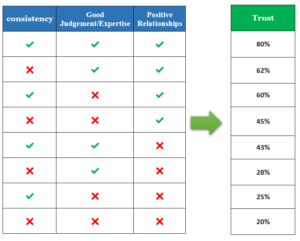 The table below is the result of a review of 360 evaluations of 87,000 leaders which shows that trust is higher when there is only good relationships than when there is judgment and consistency together.